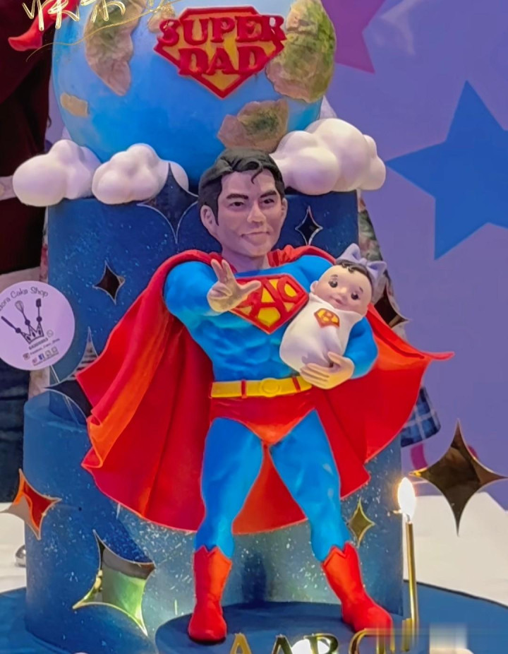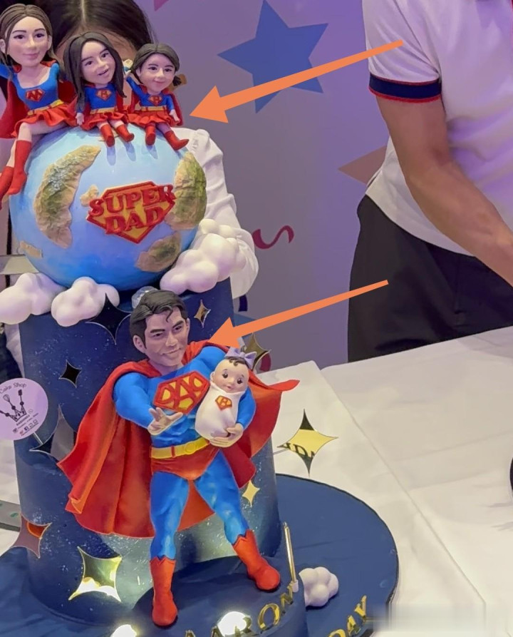 其中一个蛋糕上面还做了一家五口的图案,全都是卡通超人的造型,方媛带着俩女儿坐上面,郭富城则抱着襁褓里的三女儿站在下面,喜感十足,同时又很有爱,可见郭富城说再来一个女儿是真的高兴,第三次当爸爸的喜悦都在细节里展现出来了。
